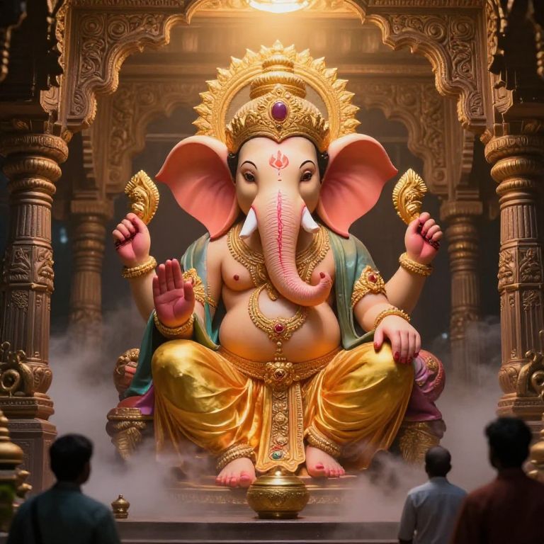 Hindu god prompt: A celestial visualization of Lord Ganesh welcoming visitors at the entrance of a heavenly temple, with a large mouse-headed form, holding a begging bowl and surrounded by mystical fog and golden light.