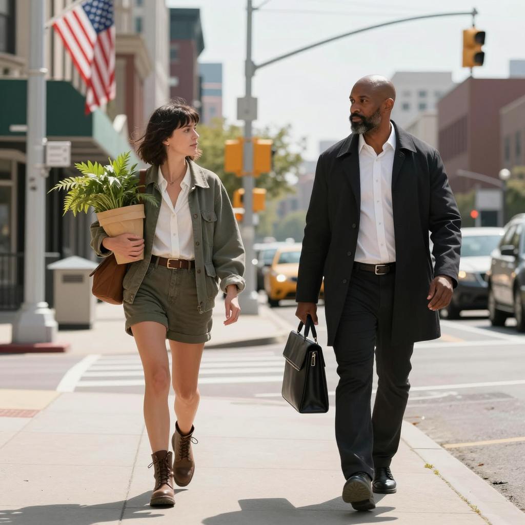 Two people walking on a city street. A woman with short dark hair, green jacket, white shirt, green shorts, and brown boots carries green plants in her left hand. A bald man with a beard, black coat, white shirt, and black pants carries a briefcase in his right hand. Background includes buildings, American flag, traffic lights, and parked cars. Sunlight casts shadows on the street.