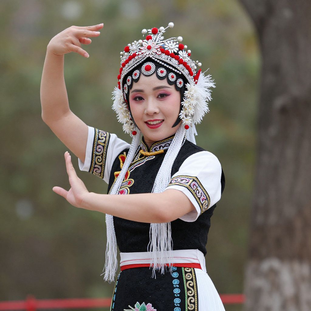 Photograph of an Asian woman in traditional black and white ethnic dance attire, adorned with red and white floral headpiece, performing graceful arm movements outdoors.