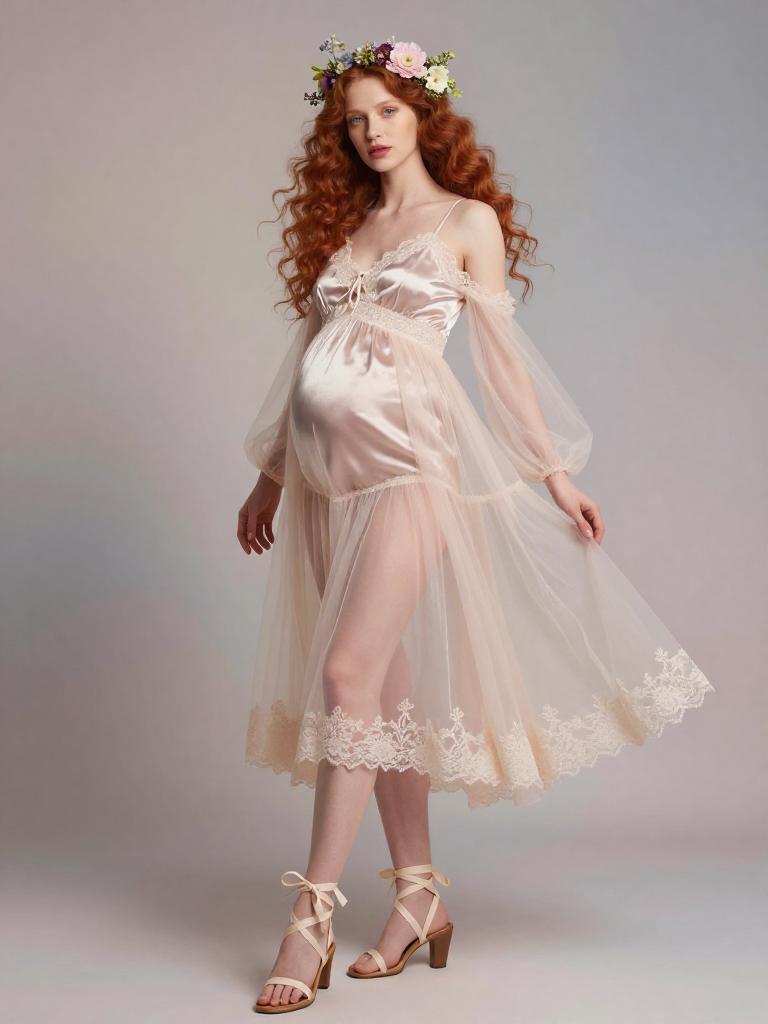 Elegant pregnant woman with long ginger curly hair and a pronounced baby bump, wearing a soft pink silky camisole dress with lace trim and sheer flowing sleeves. The dress features a gauzy A-line skirt with embroidered hem. She is adorned with a floral headband and lace-up sandals with thin ribbons, standing against a soft pastel gradient studio backdrop. The image showcases whimsical, ethereal, and nature-inspired high-end maternity fashion.