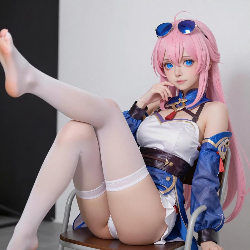Digital artwork of a pink-haired anime girl with blue eyes, wearing a blue and white outfit, sitting on a wooden chair. She has her left leg raised, exposing white panties, and her right hand touching her cheek. She wears blue sunglasses on her head. The background is a white wall with a black corner.