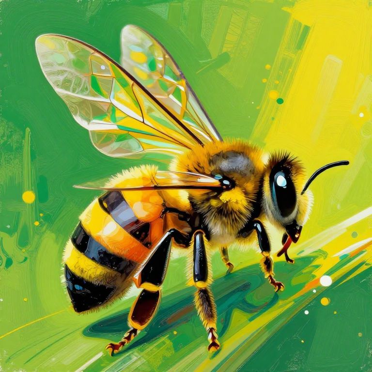 Vibrant digital illustration of a bee with detailed, translucent wings and yellow-black striped abdomen, set against a bright green, abstract background.