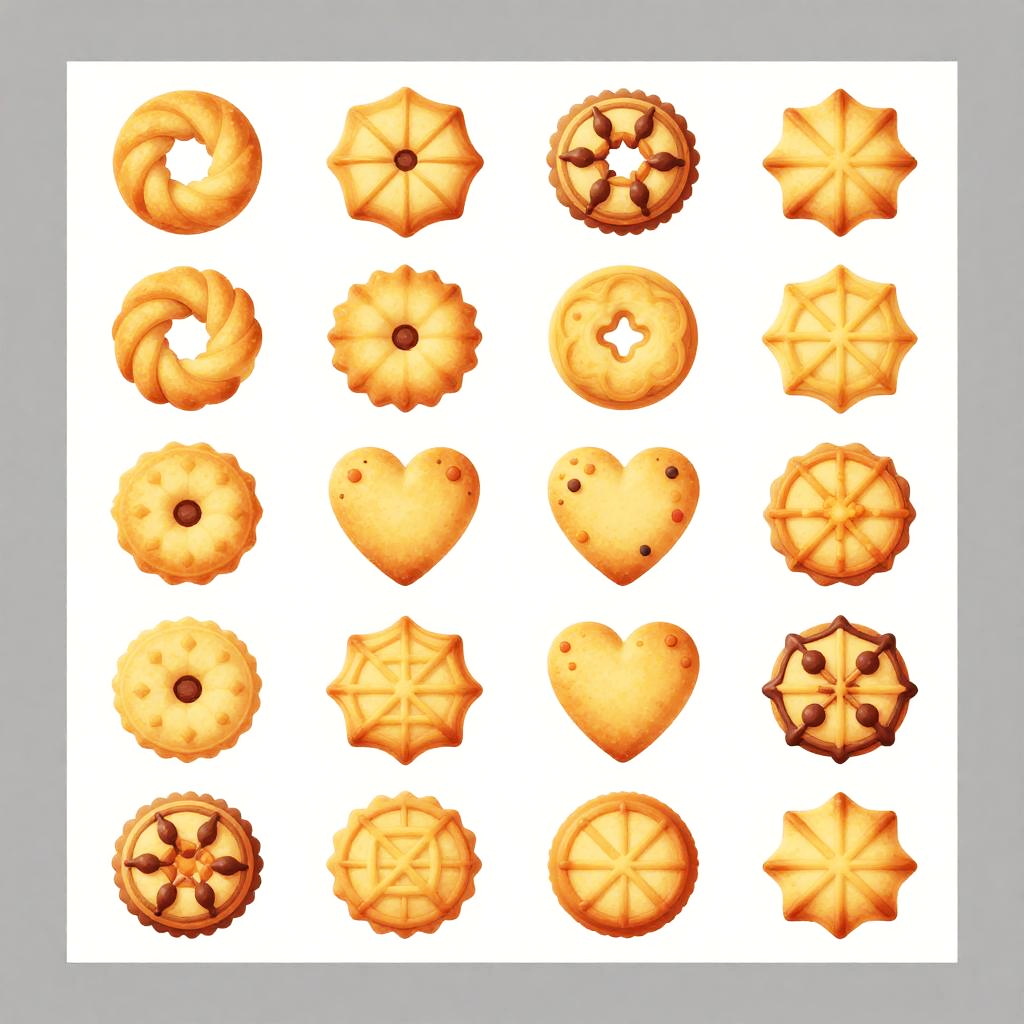 Digital illustration of 16 golden, varied-shaped cookies with patterns, arranged in a 4x4 grid on a white background.