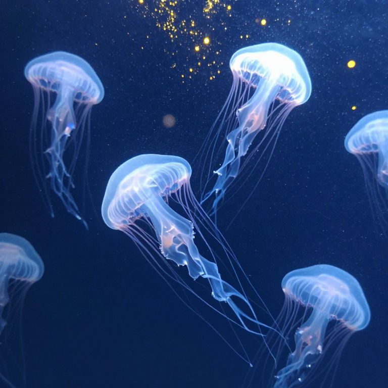 Photograph of glowing blue jellyfish with translucent, flowing tentacles against a dark blue underwater background, dotted with sparkling yellow lights.