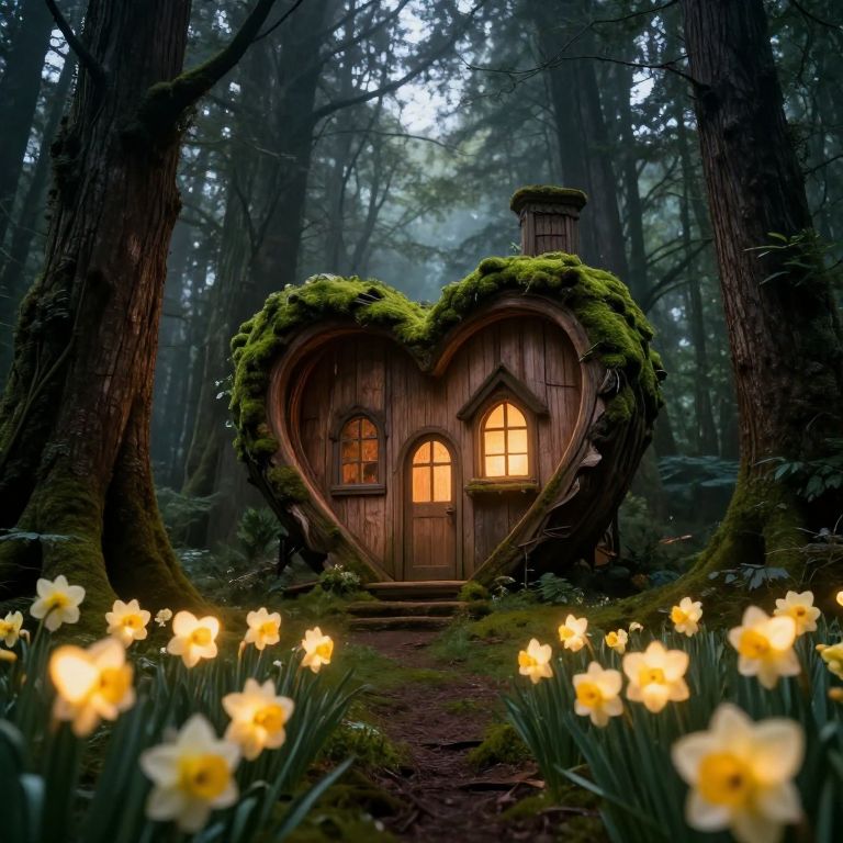 The image presents a captivating scene set in a dense, mystical forest, bathed in a magical, cinematic lighting that enhances the ethereal atmosphere. At the heart of the scene stands a heart-shaped house, constructed from wood and adorned with moss, exuding a sense of enchantment and wonder. The house, with its warm, inviting glow, is nestled among towering trees, their trunks reaching upwards into the misty sky. In the foreground, a cluster of heart-shaped daffodils, their petals glowing with a soft, golden light, add a touch of whimsy and fantasy to the scene. The overall composition, with its interplay of shapes, textures, and colors, evokes the style of John Frederick Kensett and Hayao Miyazaki, blending elements of nature and fantasy in a harmonious and dreamlike manner.