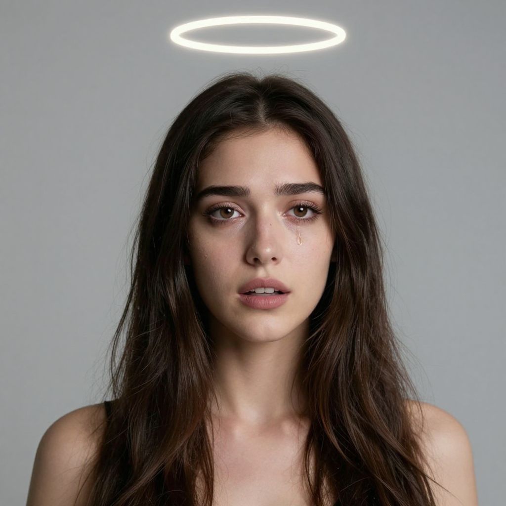 Photograph of a young woman with long, dark brown hair, pale skin, and brown eyes, wearing a glowing white halo against a gray background.