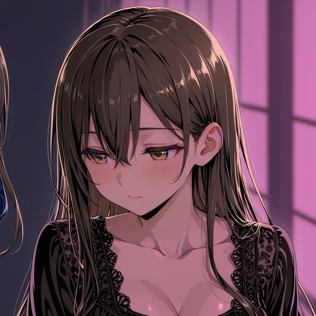 Digital anime-style illustration of a young woman with long brown hair and medium-sized breasts, wearing a black lace dress. She has soft brown eyes and a contemplative expression. The background features a softly lit interior with purple hues.