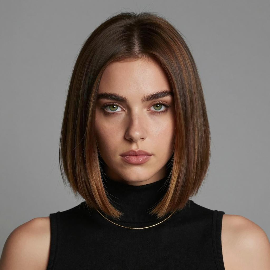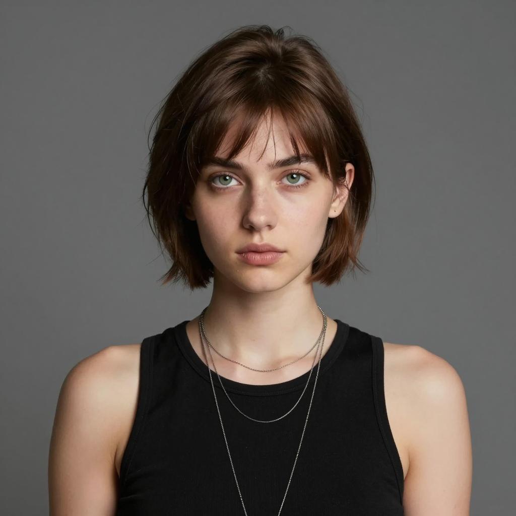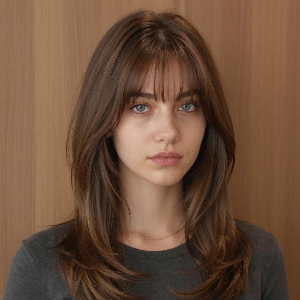 Over hairstyle bangs, photo-realistic portrait of a young woman, wavy brown hair with blonde highlights, bangs, blue eyes, wearing a black mesh top, neutral expression, soft lighting, blurred brown background, portrait orientation, digital art, high detail, natural makeup, subtle ures in hair, realistic hair strands, medium shot, centered composition