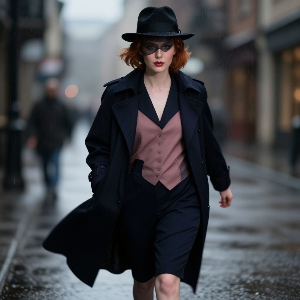 Hyperrealistic art Film Noir Elegance - A 1920s Private Eye on the Trail, In the city's underbelly, a 1920s private investigator prowls the rain-soaked streets, (draped in a trench coat that billows with the rhythm of her purposeful steps:1.2). The coat's deep hue, reminiscent of the shadows she navigates, conceals her form as she delves into the enigmatic cases that define her career. With a fedora casting a veil over her eyes, she becomes an embodiment of film noir elegance, embodying the mystery and allure of a bygone era., (masterpiece:1.3), (extremely intricate), (photorealistic:1.4), (extremely delicate), (ultra realistic:1.3), CG unity, 8k wallpaper, HDR, RAW photo, dslr, front lighting, fantasy, elegant, lifelike, photorealistic, digital painting, (realistic skin texture, soft light, sharp:1.2), crisp image, sharp image, clear image, vivid image, noiseless image, (((clean skin, neat skin, perfect skin))), (Layered Depth, Parallax Effect, Soft focus foreground), vivid hues, fantasy setting, pronounced elaborated, imanating a soft, other worldly glow, (whimsical atmosphere:1.1), (powerful energy:1.1), (((full body view:0.86))), ((hands aside)), (very beautiful young female face:0.8), (high detailed skin texture, intricate face), (highly symmetric proportions:0.6), perfect teeth, (sharp_pointed_nose:0.6), high detailed eyes, intricate eyes, cute female face, (perfect skin, detailed realistic pale skin), (supermodel), shimmering skin, glossy skin, the most beautiful girl in the world, ((blush:1)), (copper red hair, . Extremely high-resolution details, photographic, realism pushed to extreme, fine texture