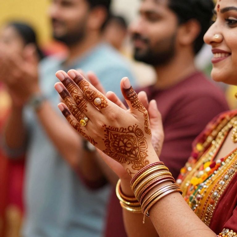 Macro shot of hands clapping while performing the macarana dance, adorned with bracelets and henna tattoos, soft-focus dancers in background, warm vibrant colors, festive and energetic mood, intricate focus on movement and joyful expressions