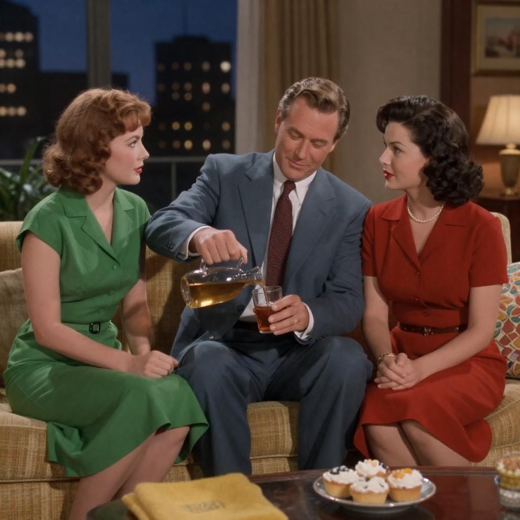 Photograph of a 1950s-style movie poster. Group of seven people, six women and one man, in formal attire, holding drinks. Women in colorful dresses, one in yellow, man in black tuxedo. Bright smiles, social gathering. Background shows indoor setting with window. "Dramatic School" in red and white.