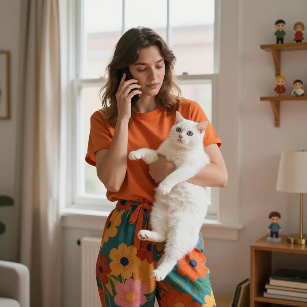 Woman with short dark hair, smiling, wearing blue-striped pajamas, sitting on beige couch. Black and white cat with a black head and white face nuzzles her hand. Brown pillow on couch, patterned blanket in background. Dimly lit room.