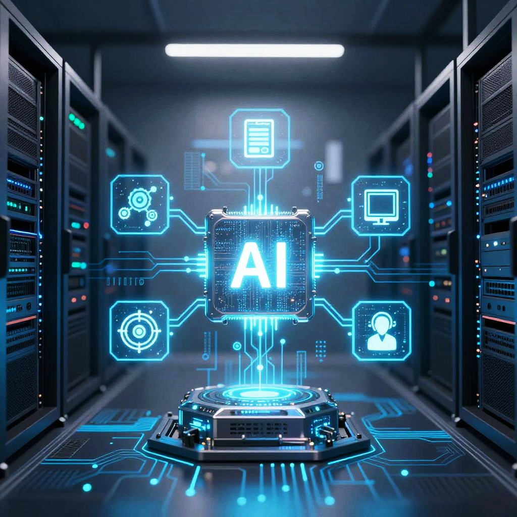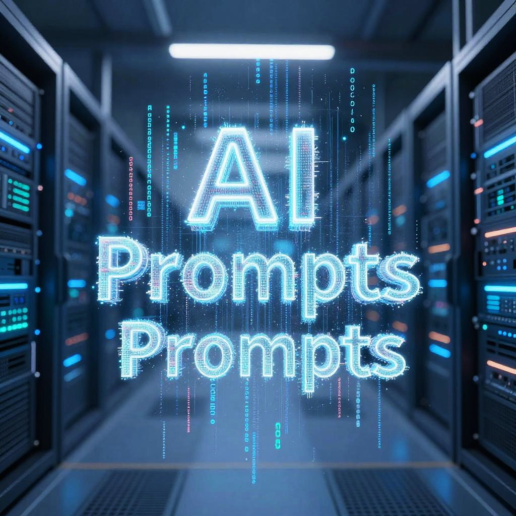 Realistic AI prompts visualized as floating 3D text fragments surrounded by swirling particles of light and code, set within a futuristic data center with racks of glowing servers, cold blue lighting, photorealistic style with depth and texture.