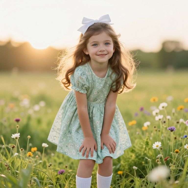 A young girl with soft, flowing brown hair and gentle blue eyes stands in a sunny meadow, wearing a light green dress with delicate floral patterns, a white bow tied neatly on her head, and white socks that match the clean, fresh look of her outfit. She smiles warmly, her hands resting lightly on her knees, surrounded by blooming wildflowers and a soft golden sunrise in the background. The scene is bright, cheerful, and idealized, with a touch of whimsy and innocence.