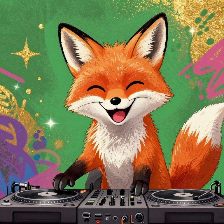 Stippling happy smiling fox, DJ, turntables, graffiti art, green and gold, vibrant, joyous, warm, loving,