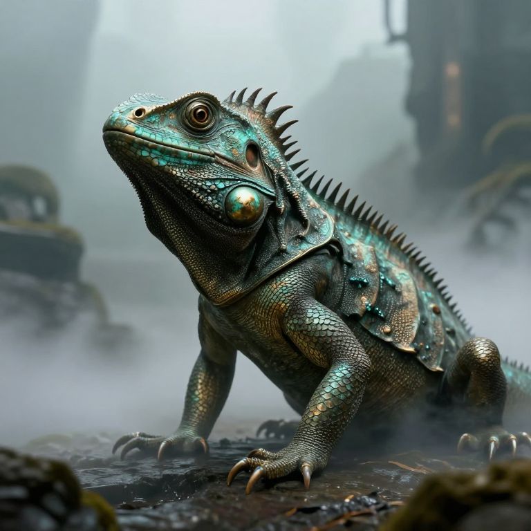 Digital artwork of a detailed, iridescent iguana with blue-green scales and black spines, standing on a misty, rocky terrain.