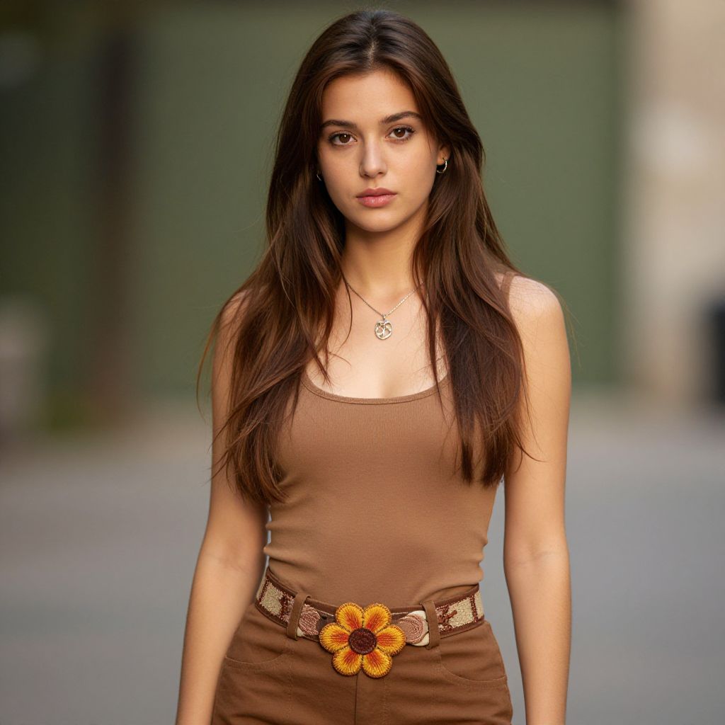 Photograph of a young woman with long, straight dark brown hair and olive skin, standing against a blurred green and gray urban background. She wears a sleeveless, form-fitting brown dress with a decorative orange and yellow flower-buckled belt at the waist. Her expression is neutral, with slightly parted lips and dark, defined eyebrows. She has a small, delicate silver necklace with a circular pendant. The focus is on her, with a shallow depth of field blurring the background. Her overall look is natural and stylish, with a minimalist yet chic fashion sense.