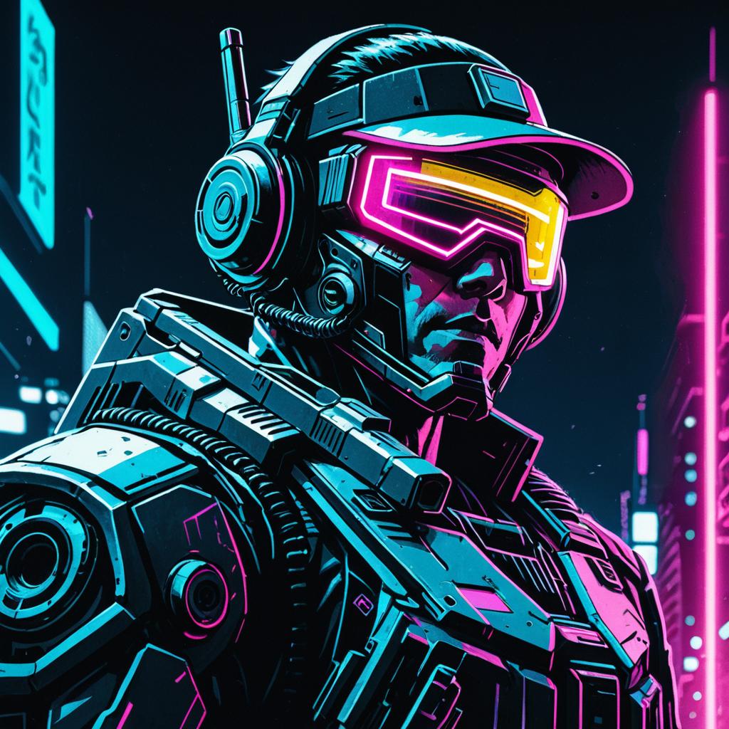Close-up digital art of a futuristic cyborg man wearing a high-tech helmet with neon visor and headphones, holding a gun. The artwork features bold synthwave colors with bright pink, blue, and yellow highlights, set against a dynamic neon background. The style is inspired by cyberpunk and retro-futuristic aesthetics.