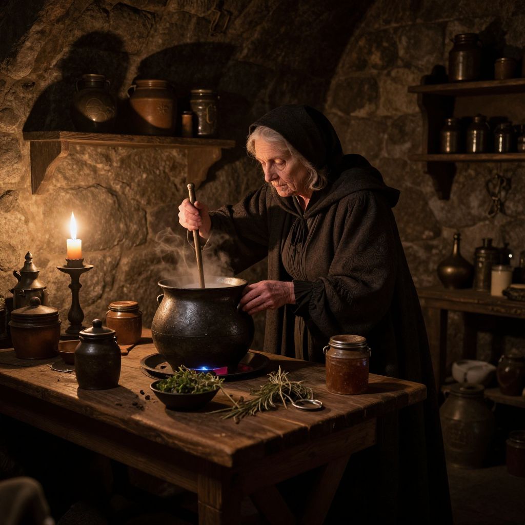 In a dimly lit, stone-walled tower, an elderly woman, dressed in a dark cloak and headscarf, crouches over a large, ancient pot on a wooden table. The table is cluttered with various pots, jars, and herbs, suggesting a workspace for potion-making. A single candle casts a warm, flickering light, illuminating the scene and creating a cozy, yet mysterious atmosphere. The woman's hands are busy, as she carefully stirs a pot of bubbling liquid with a long, thin tool. The walls are adorned with shelves holding more pots and jars, hinting at a well-stocked apothecary. The overall composition is dynamic, with the woman's hunched posture and the pot's active bubbling creating a sense of movement and focus. The scene is highly detailed, with realistic textures and lighting, enhanced by advanced rendering techniques such as ray tracing, subsurface scattering, and volumetric lighting. The image is a masterpiece, capturing the essence of a 17th-century witch's laboratory with remarkable realism and artistry.