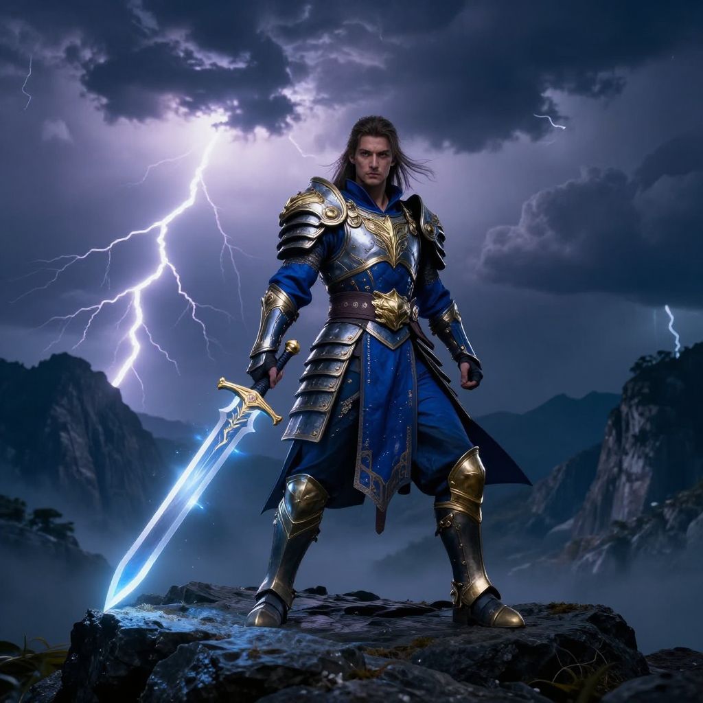 Character.aj portrayed as an ancient mythological hero, clad in ornate golden armor with intricate engravings, holding a glowing sword atop a mountain peak, dramatic sky with lightning bolts and swirling storm clouds, epic and heroic mood.