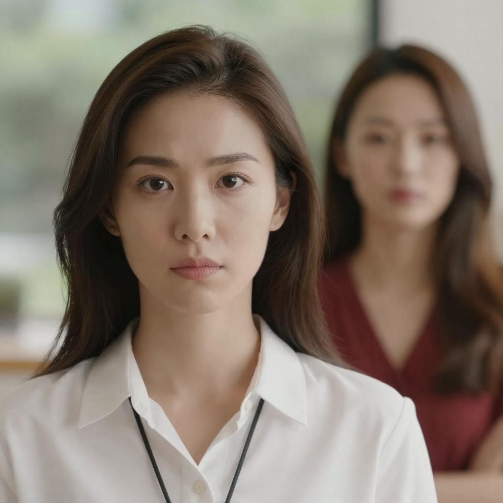Photograph of an Asian woman with long black hair, wearing a red and brown traditional outfit, raising her right hand in a defensive gesture. She has a white dot on her forehead. The background shows a dimly lit office with cubicles, papers, and fluorescent lights. Her expression is intense and focused.