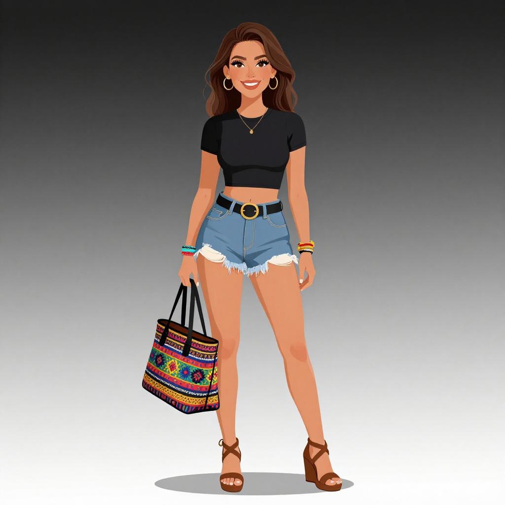 Digital illustration of a smiling young woman with light brown skin and long brown hair. She wears a black, short-sleeved crop top, high-waisted, light blue denim shorts with frayed edges, brown ankle-strap sandals, and multiple colorful bracelets on her right wrist. She holds a vibrant, patterned tote bag in her left hand. Her makeup is subtle, and she has small hoop earrings. The background is a gradient from dark gray at the top to white at the bottom. The style is modern and vibrant, with a focus on casual summer fashion.