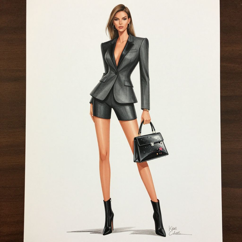 Elegant fashion illustration showcases a confident woman in a chic ensemble featuring a tailored blazer, form-fitting shorts, and high-heeled boots, accessorized with a sleek handbag and dotted with artistic splatters, signed by Kjenn Choes.