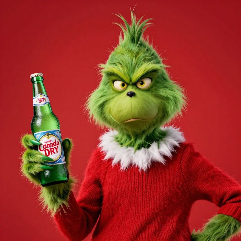 The image depicts a highly detailed and vivid portrayal of the Grinch, a well-known character from Dr. Seuss's \"How the Grinch Stole Christmas.\" The Grinch, with his iconic green skin and wild, spiky hair, is depicted in a realistic and expressive manner, reminiscent of Jim Carrey's portrayal in the animated film. He is wearing a festive red sweater with white fur trim, adding to the holiday atmosphere. In his hand, he holds a green bottle of Canada Dry ginger ale, which stands out against the red background. The bottle features a red and white label, with the brand name \"Canada Dry\" prominently displayed. The overall composition is dynamic, with the Grinch's face turned slightly to the side, giving a sense of movement and character. The use of vivid colors and detailed textures creates a lively and engaging scene, capturing the essence of the Grinch's mischievous spirit.
