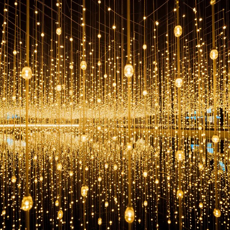 This photograph captures a dense, vertical array of glowing yellow and orange lights suspended against a black background. The lights vary in size, resembling small to medium-sized orbs, and are connected by thin, nearly invisible wires. The illumination creates a mesmerizing, sparkling effect, with the lights concentrated more densely in the center and gradually dispersing towards the edges. The reflection of the lights on a dark, glossy surface below adds depth and contrast, enhancing the visual impact. The overall composition is abstract, evoking a sense of whimsical, magical light installation.