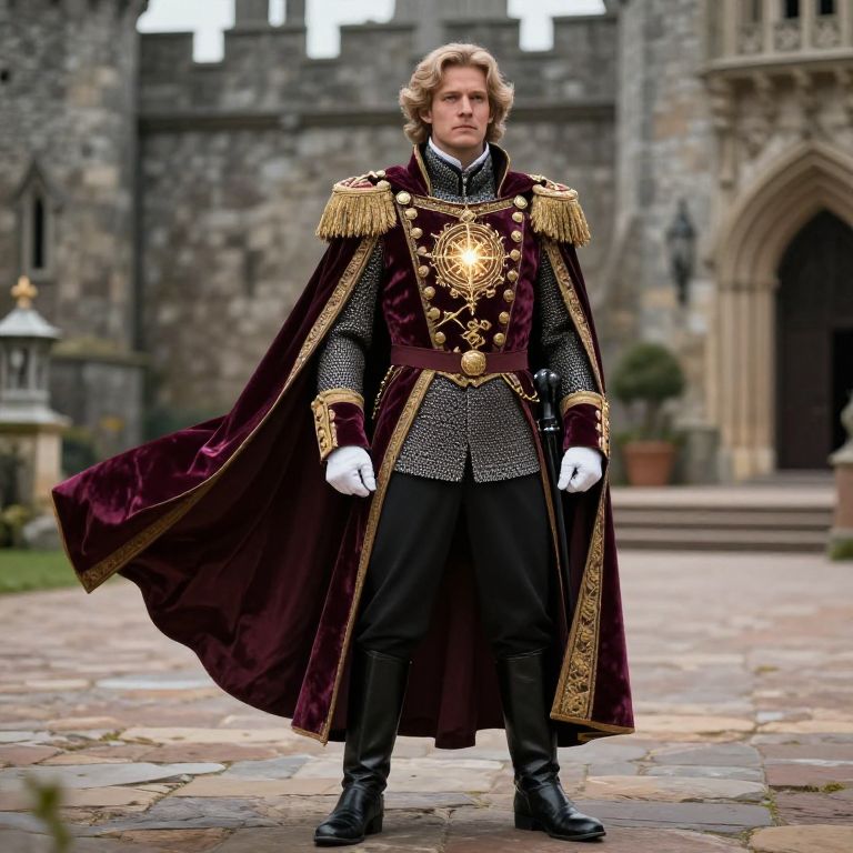Photograph of a young white man with curly blonde hair, standing confidently in front of a medieval stone castle. He wears an ornate, dark maroon velvet military coat with gold epaulettes and intricate gold embroidery on the chest, over a silver chainmail tunic and black pants. His white gloves contrast with his black boots. The background shows a cobblestone courtyard with potted plants and a lantern. The castle's stone walls and arched doorway are visible, adding a historical, regal ambiance to the scene. The man's serious expression and poised stance command attention.