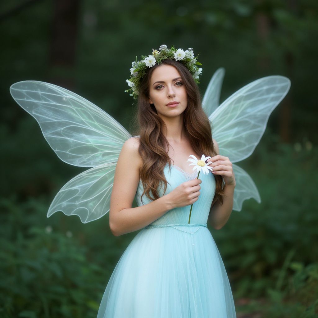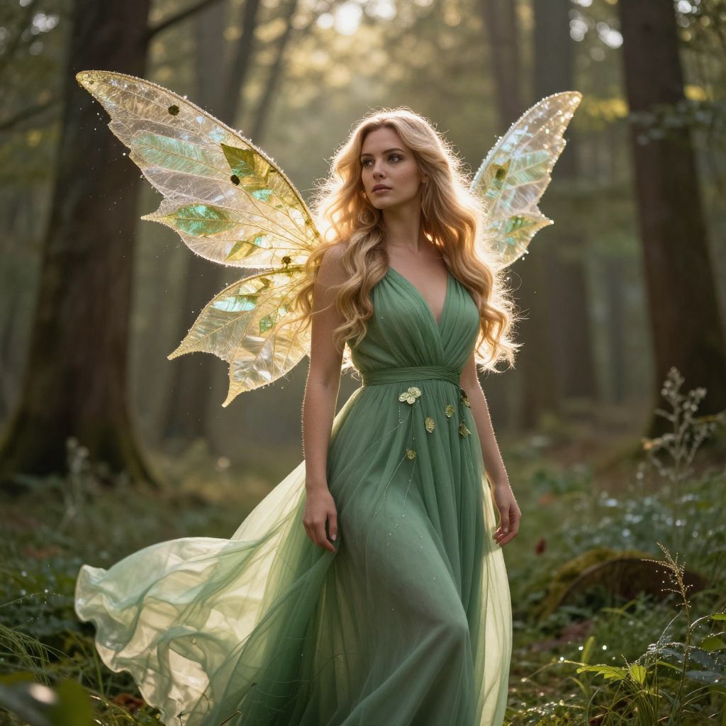 Woman with blonde hair wearing a green dress with wings and a flower in her hair.