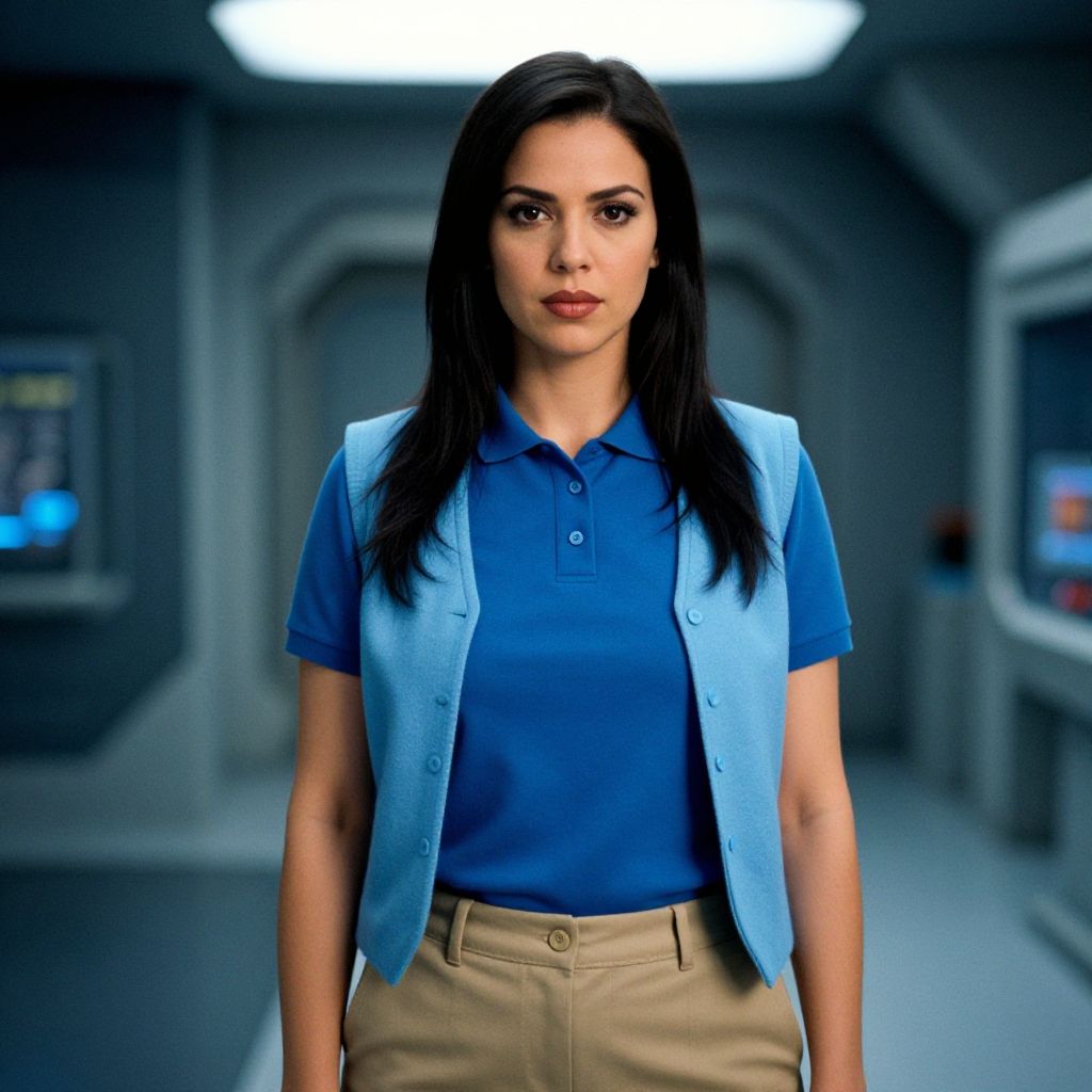 Photograph of a serious-looking woman with long black hair, wearing a blue shirt, blue vest, and beige pants, standing in a futuristic, dim