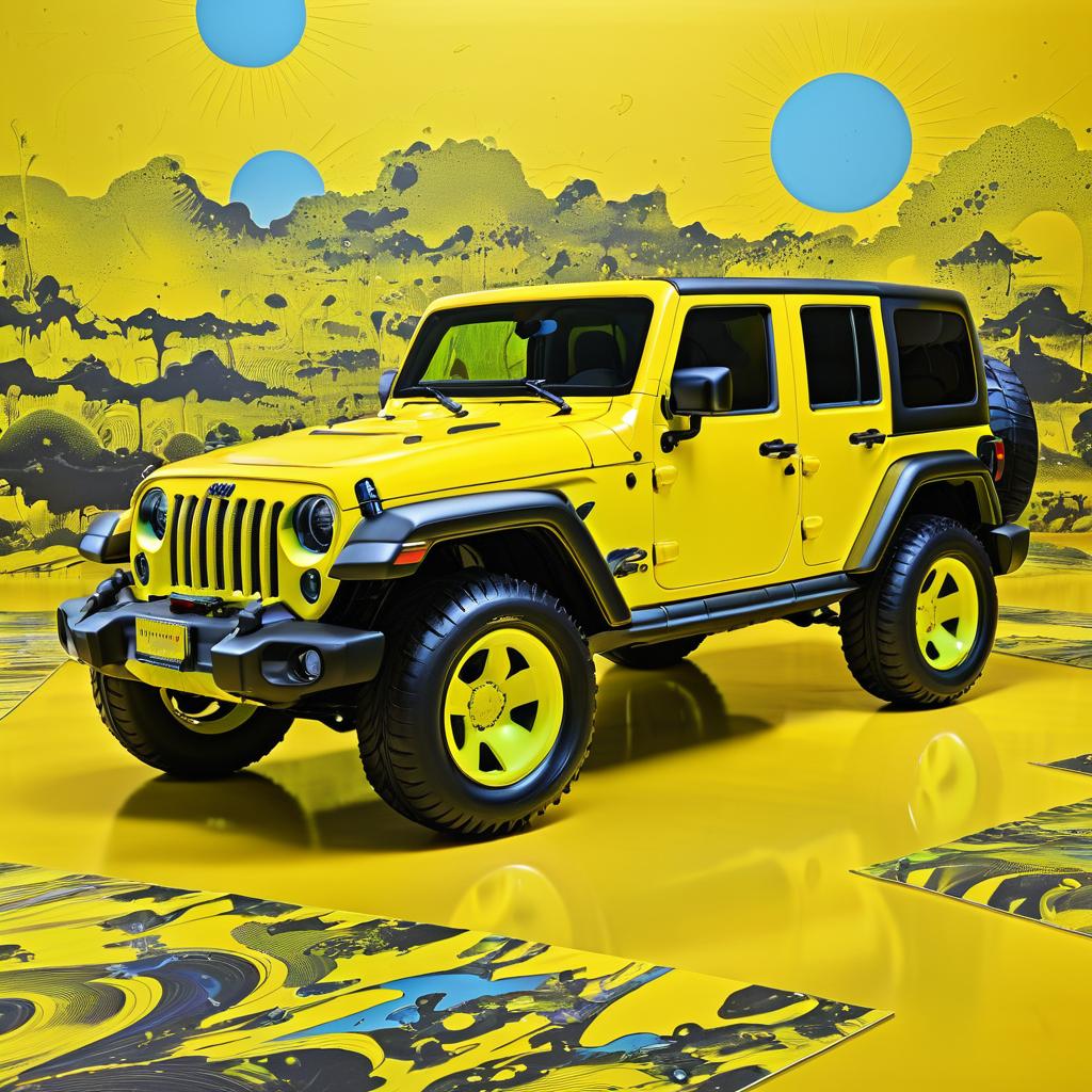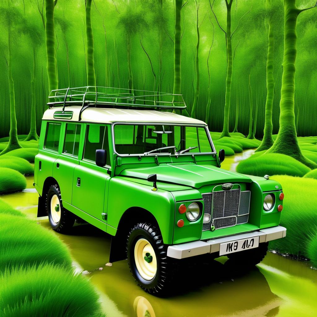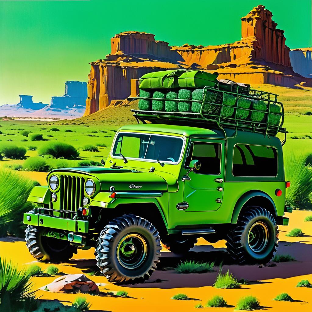A rugged green Jeep, no people, styled by Frank Frazetta, with vibrant colors and comic cover art influences.