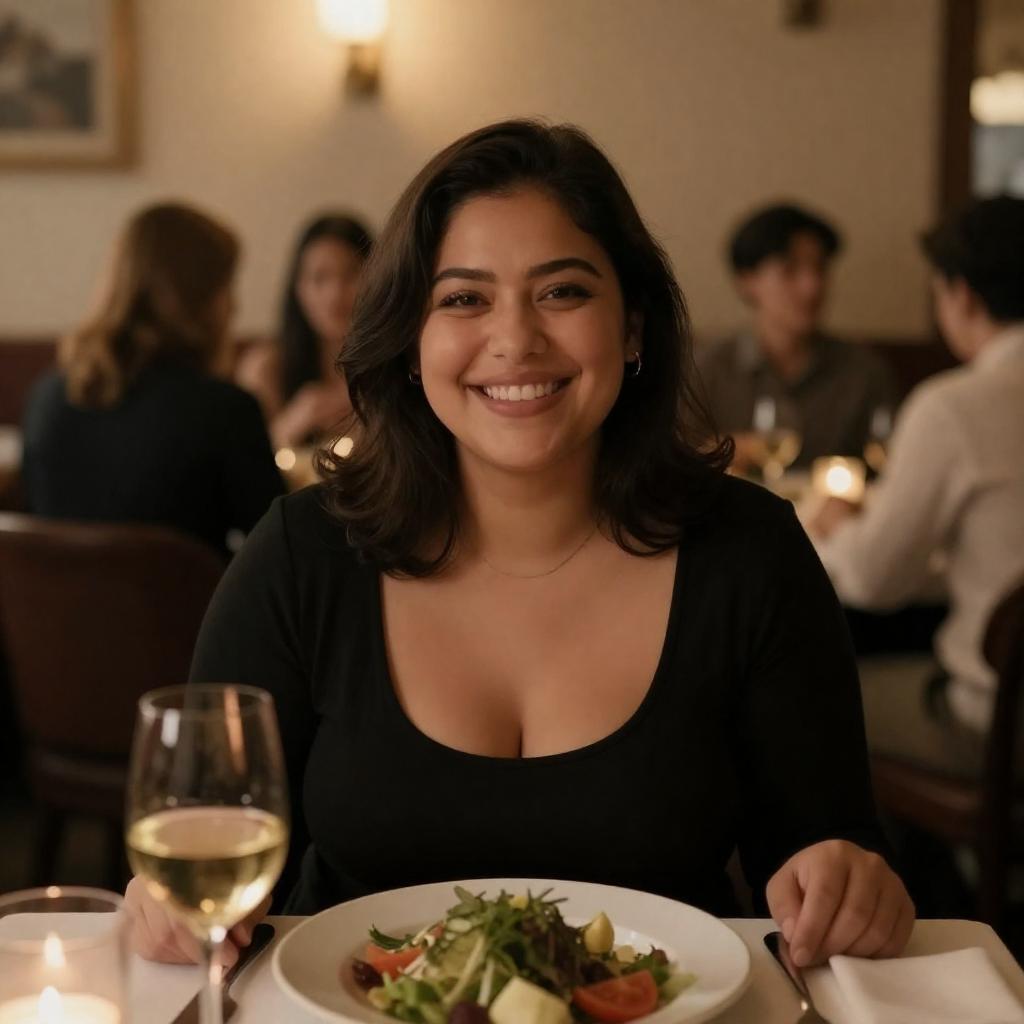 Photograph of a smiling woman with dark hair in a black, low-cut top, seated at a dimly lit restaurant table. She has a medium build and is wearing a black cardigan. In the background, three other people are seated at separate tables, engaged in conversation. The table in front of her has a plate of salad and a glass of wine. Warm, ambient lighting creates a cozy atmosphere.