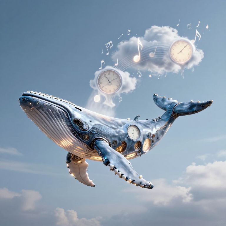 A colossal mechanical whale glides serenely through the sky, its glowing interior revealing a surreal landscape of swirling clouds shaped like musical notes and melting clocks, defying the boundaries of time and reality.