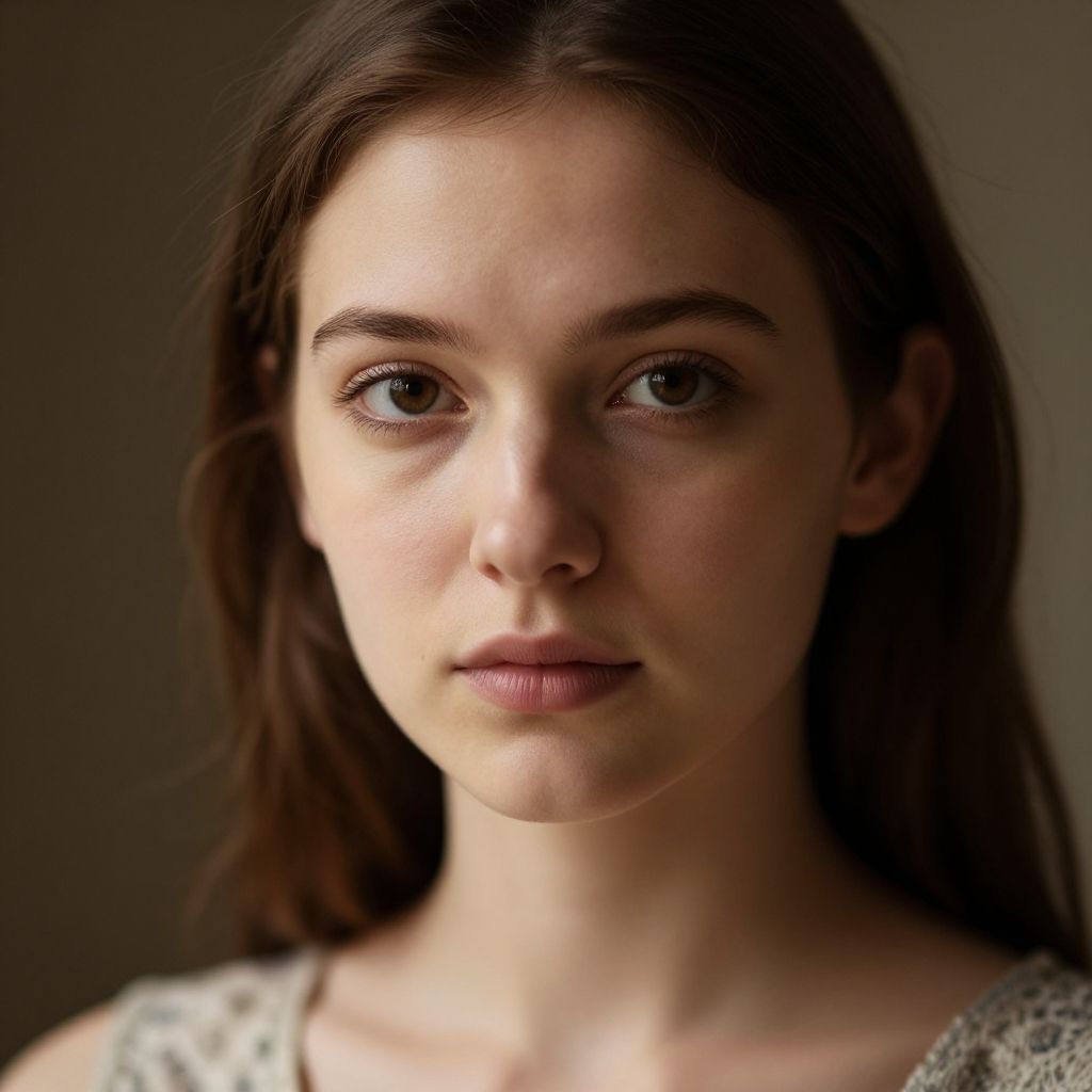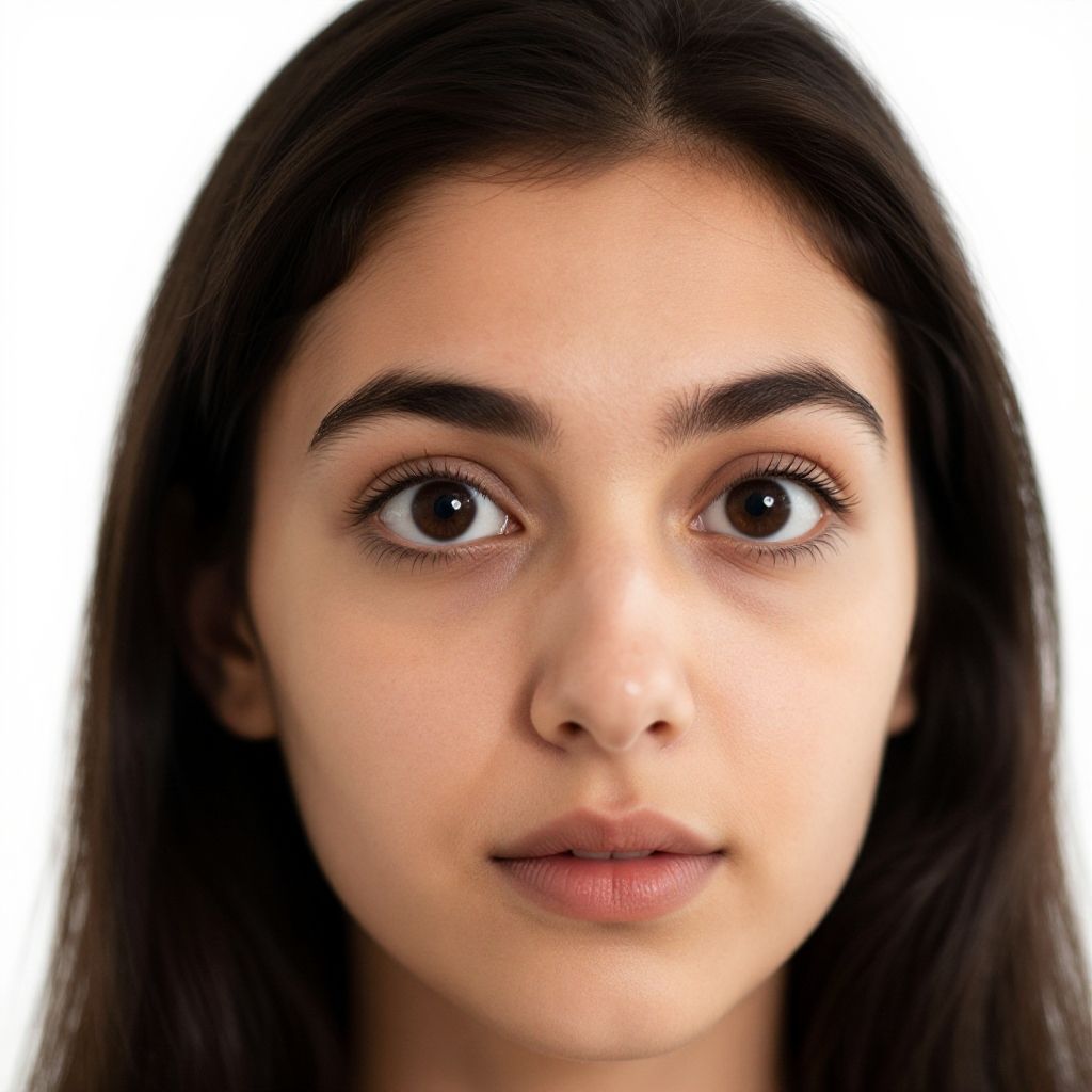 Photograph of a young woman with medium-light brown skin and straight, dark brown hair framing her face. She has large, dark brown eyes with slightly arched eyebrows, full lips with a natural pink hue, and a small, slightly upturned nose. Her expression is neutral, with a slight, closed-mouth smile. The background is a plain, bright white, making her face the focal point. The image has a realistic, high-resolution style with sharp detail and even lighting.