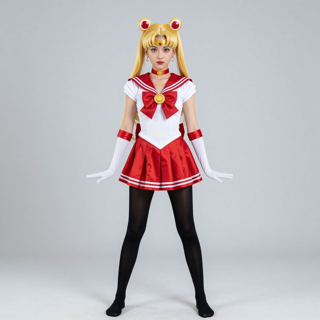 Super Sailor Moon Costume, sailor girl in a red and white dress and black tights
