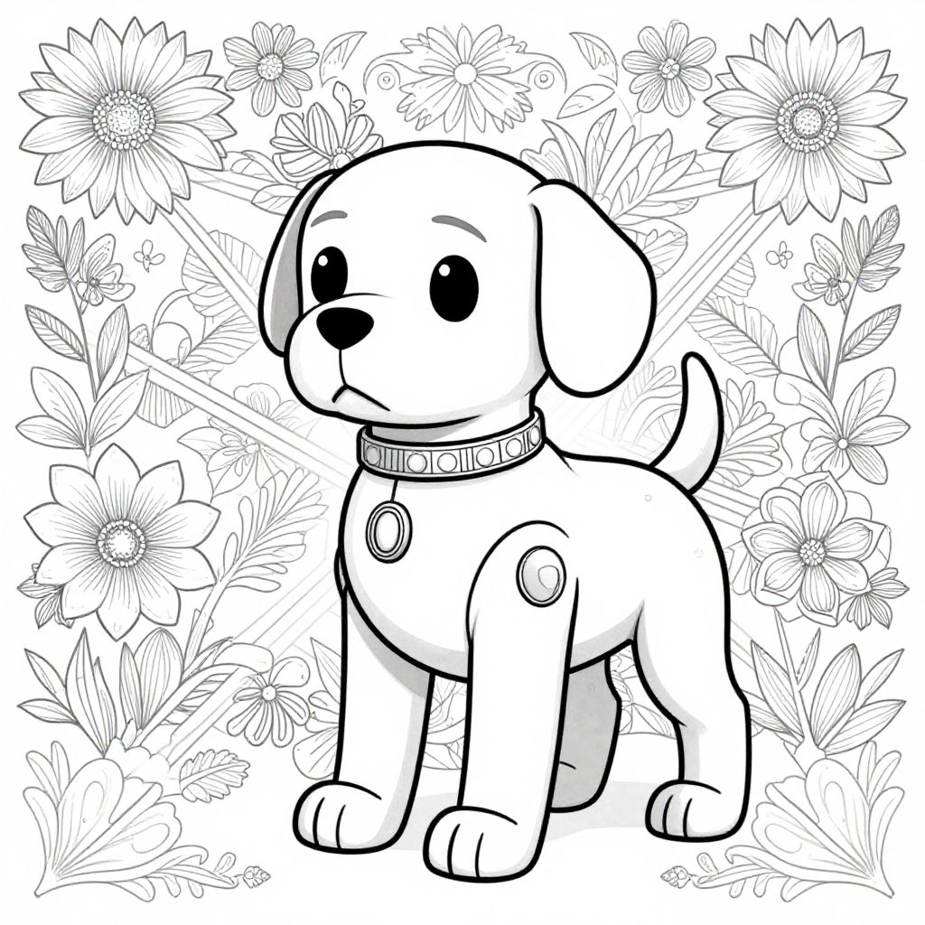 Psilocybin coloring pages for adults, a robot dog, Majestic, Digital Art, Floral patterns background, Pensive Mood, Intersecting Lines, Medium Detail, black and white, 4k,