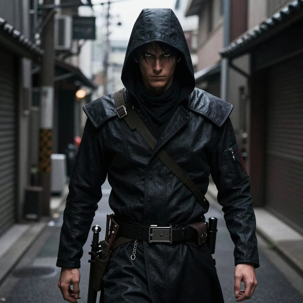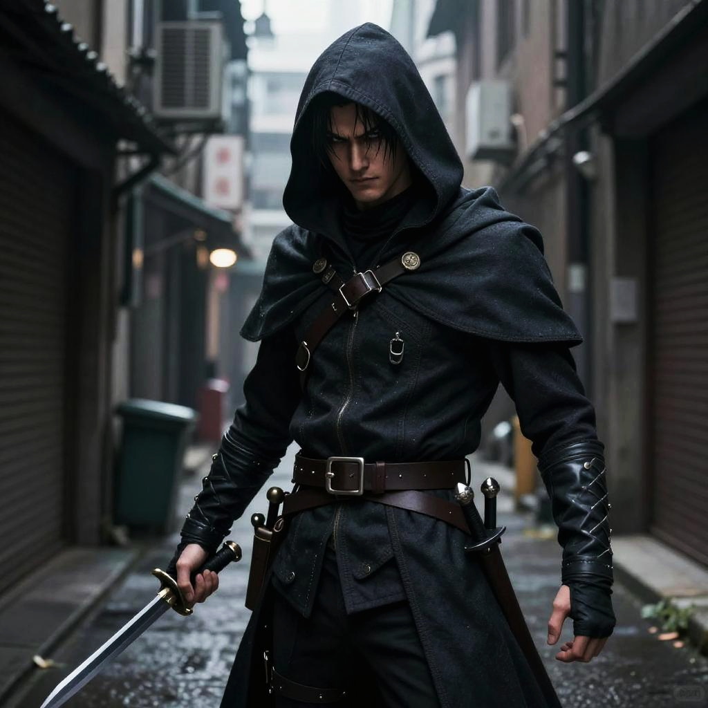 Realistic photo.a cunning rogue, wearing dark leather armor, wielding a sleek dagger, standing in a shadowy alley, illustrated in the gritty and realistic anime style of Makoto Yukimura. realistic photo