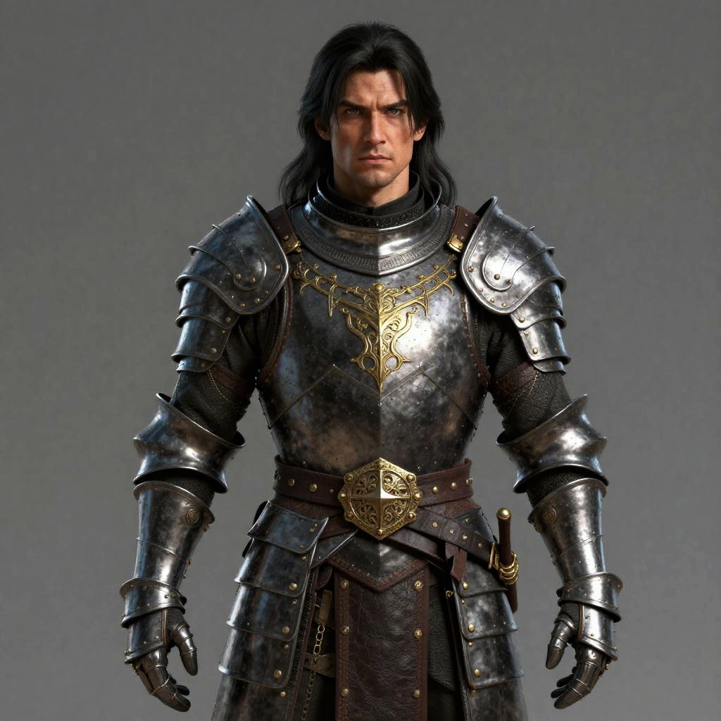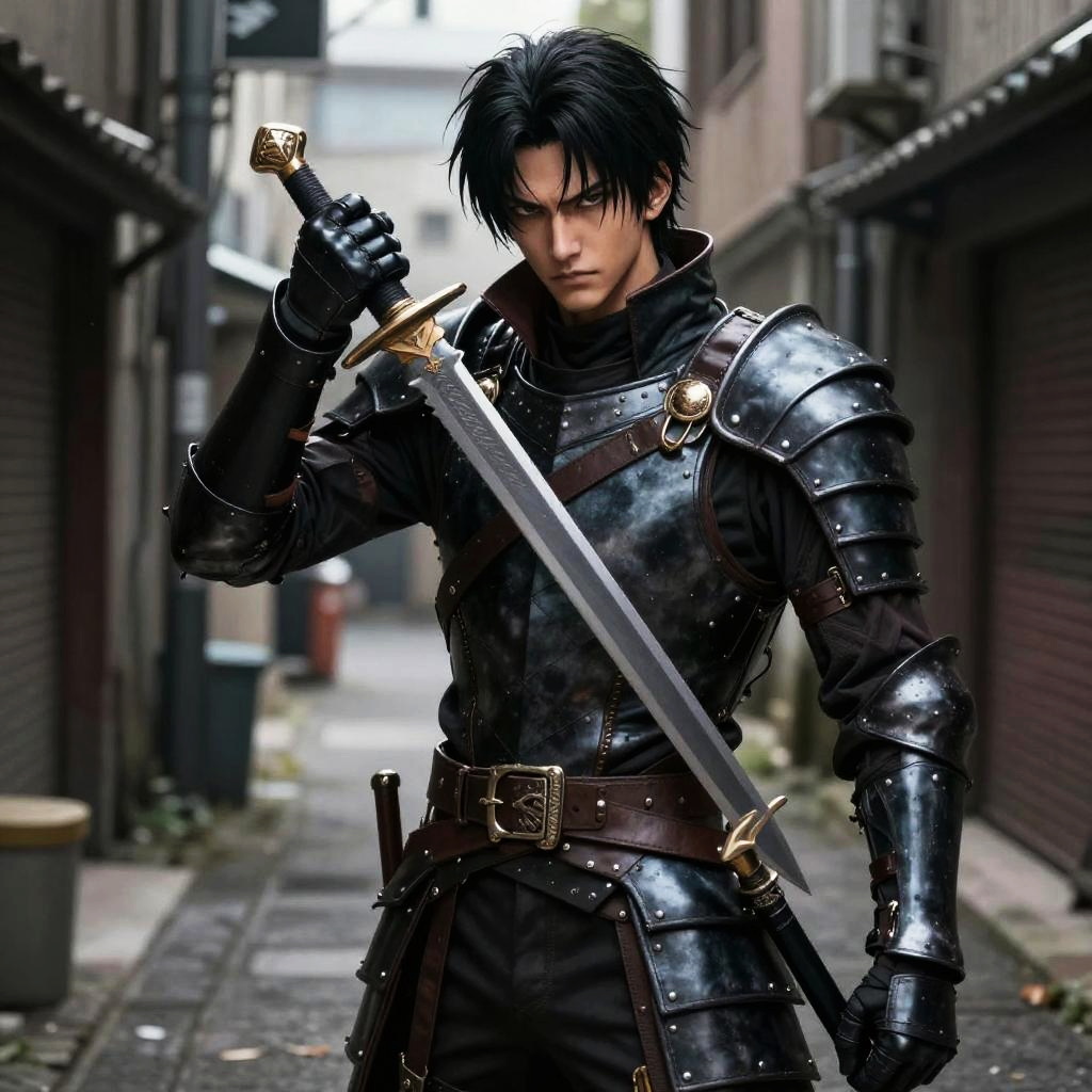 Digital art of a serious, black-haired man in shiny, dark metal armor holding a sword in a narrow, urban alley.