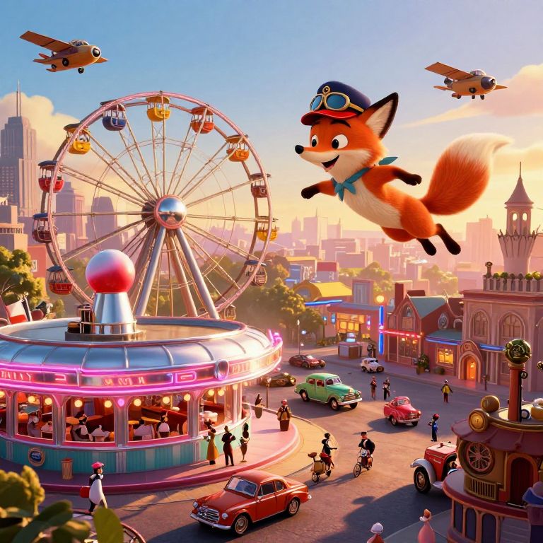 A vibrant, CGI-rendered scene features anthropomorphic foxes dressed in Victorian attire, playing guitars and holding colorful umbrellas, walking across a grassy field at sunset. The sky is adorned with floating, whimsical houses and balloons. The foxes, with orange fur and bushy tails, wear black suits, white shirts, and top hats. The grass is lush, with scattered white eggs. The sun sets behind the horizon, casting a golden glow over the scene, enhancing the playful, fantastical atmosphere. The floating structures have detailed architecture, adding to the magical, storybook-like quality of the image.