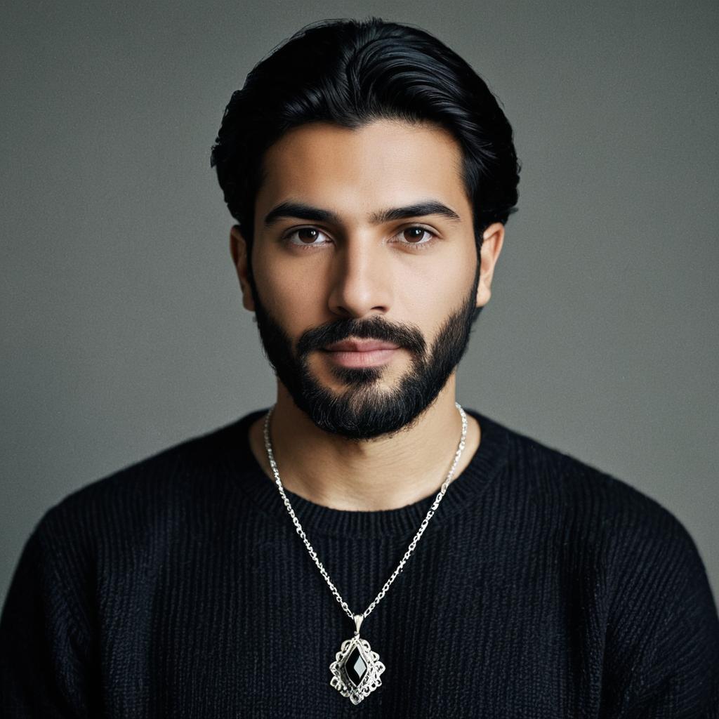 Man haircut mid length,1boy, male focus, solo, jewelry, realistic, facial hair, necklace, looking at viewer, shirt, upper body, beard, closed mouth, brown hair, black hair, brown shirt