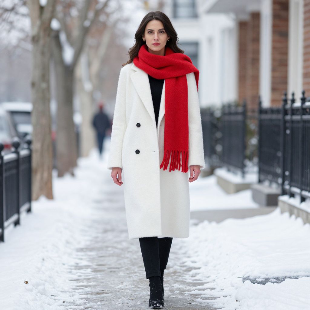 Stylish Winter Wear Costume, woman in a white coat and red scarf standing on a snowy sidewalk