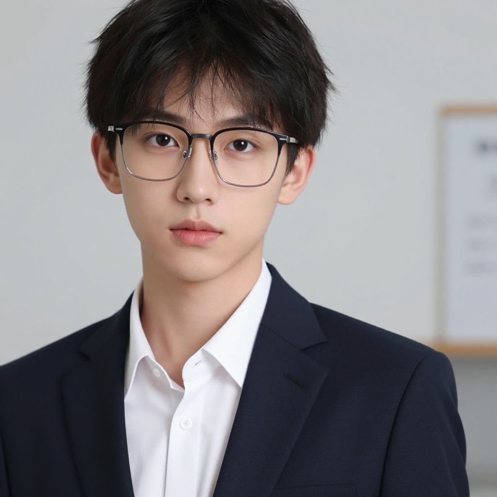 Photograph of an Asian young man with short, black, slightly messy hair and fair skin, wearing black-rimmed glasses. He is dressed in a black suit jacket over a white dress shirt. His expression is neutral, with slightly parted lips. The background is blurred but shows a light blue wall and a whiteboard with indistinct writing. The image has a clean, professional look, focusing on the subject's upper body and face. The lighting is soft, highlighting his facial features and glasses.