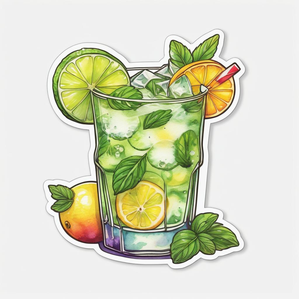 STICKER:Decorative mojito, sticker design:Mixed Media, SOLID background:Light Yellow Background, SHARP FOCUS:Stylized Fruits of A Detailed watercolor Tee shirt design display a mesmerizing cocktail presentation with vibrant colors, meticulously crafted garnishes, and an ambiance that exudes sophistication. this image should inspire viewers to appreciate the creativity and craftsmanship behind mixology Redbubble Sticker,Splash In Vibrant Colors, 3D Vector Art, Cute And Quirky, Adobe Illustrator, HandDrawn, Digital Painting, LowPoly, Soft Lighting, Bird'sEye View, Isometric Style, Retro Aesthetic, Focused On The Character, 4K Resolution