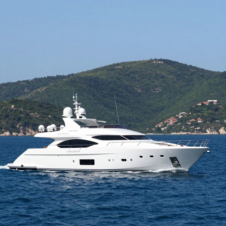 Luxurious white yacht **CASINO ROYALE** glides gracefully on calm blue waters, showcasing its sleek design and multiple decks against a backdrop of lush green hills and clear skies.
