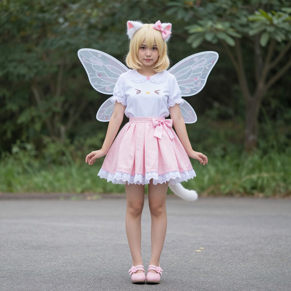 Kitty fairy costume, solo, wings, skirt, pink skirt, crossdressing, blonde hair, fairy wings, animal ears, shoes, bow, full body, hair bow, 1girl, standing, looking at viewer, fairy, shirt