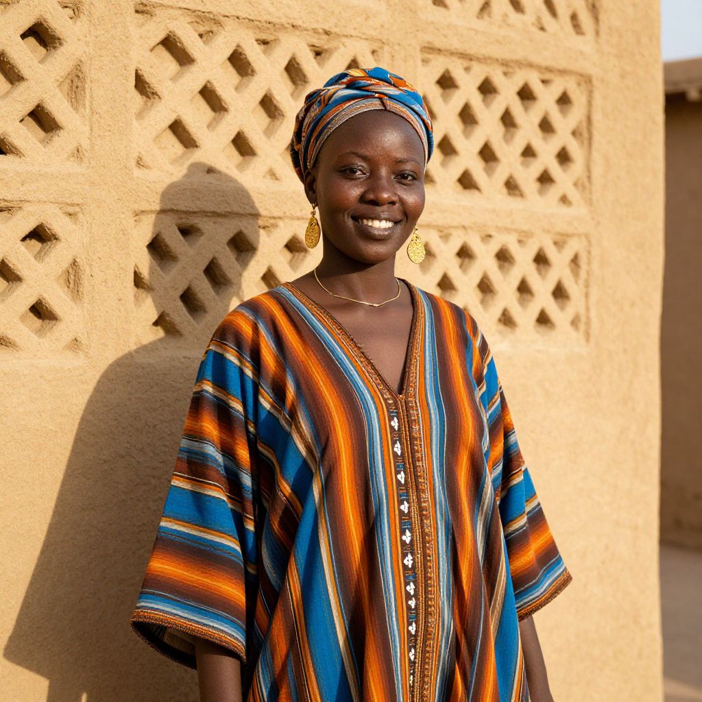 Photograph of a smiling African woman standing outdoors in front of a sunlit, beige adobe building with intricate, lattice-like patterns. She's wearing a colorful, striped, patterned robe with blue, orange, and brown hues, and a matching headscarf. She has dark skin, wears large gold earrings, and a gold necklace. The sunlight casts warm shadows, giving the scene a golden glow.