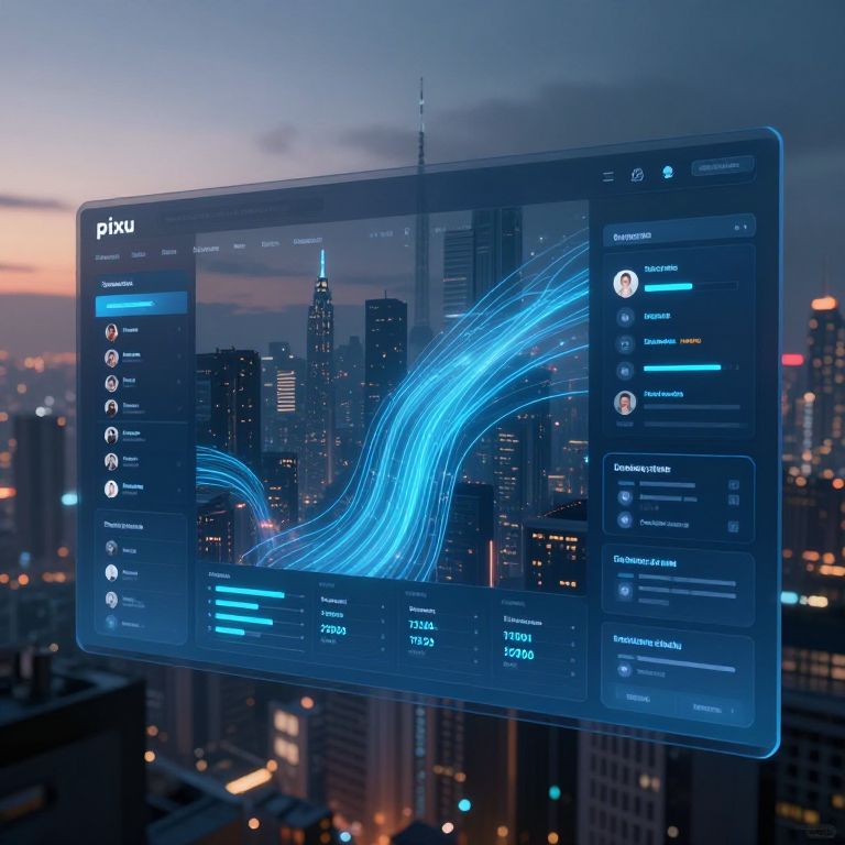 Pixu app dashboard viewed from a futuristic city skyline, with data streams flowing in real-time, glowing UI panels, and digital overlays showing user activity — cinematic, high-detail, with soft lighting and cyberpunk undertones.
