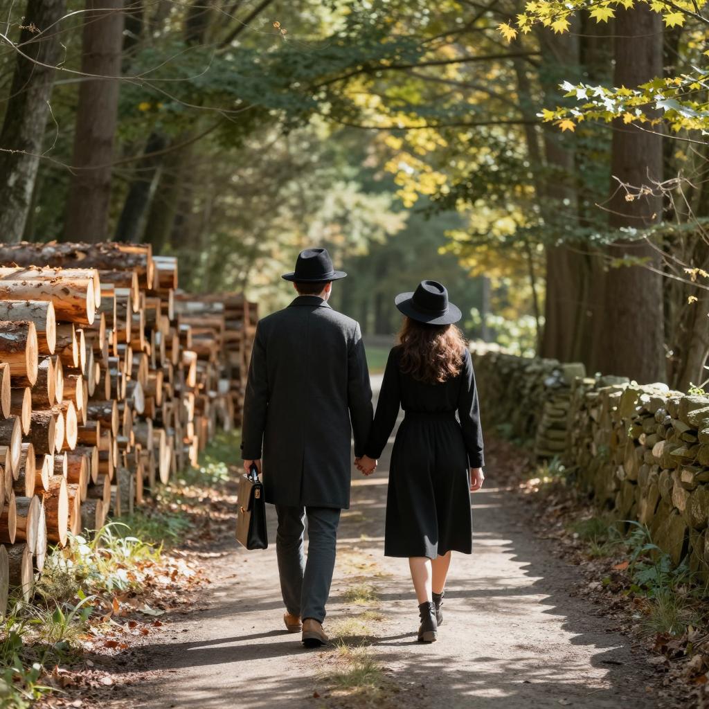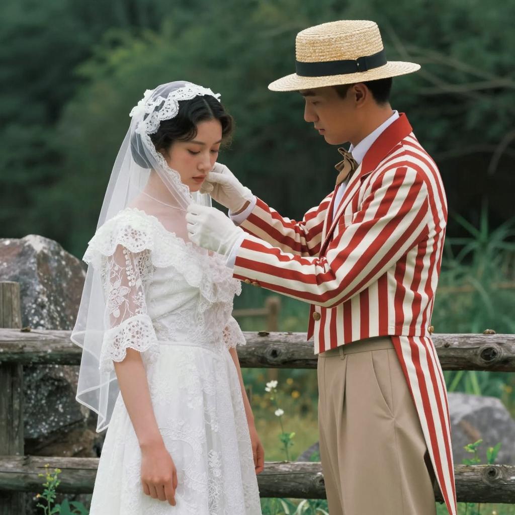 Two people in a grassy field. Man in beige suit and hat holds a baby, stands facing away. Woman with braided hair, white lace dress, and white hat stands in foreground, looking at man. Dense forest in background. Sunlight casts shadows.